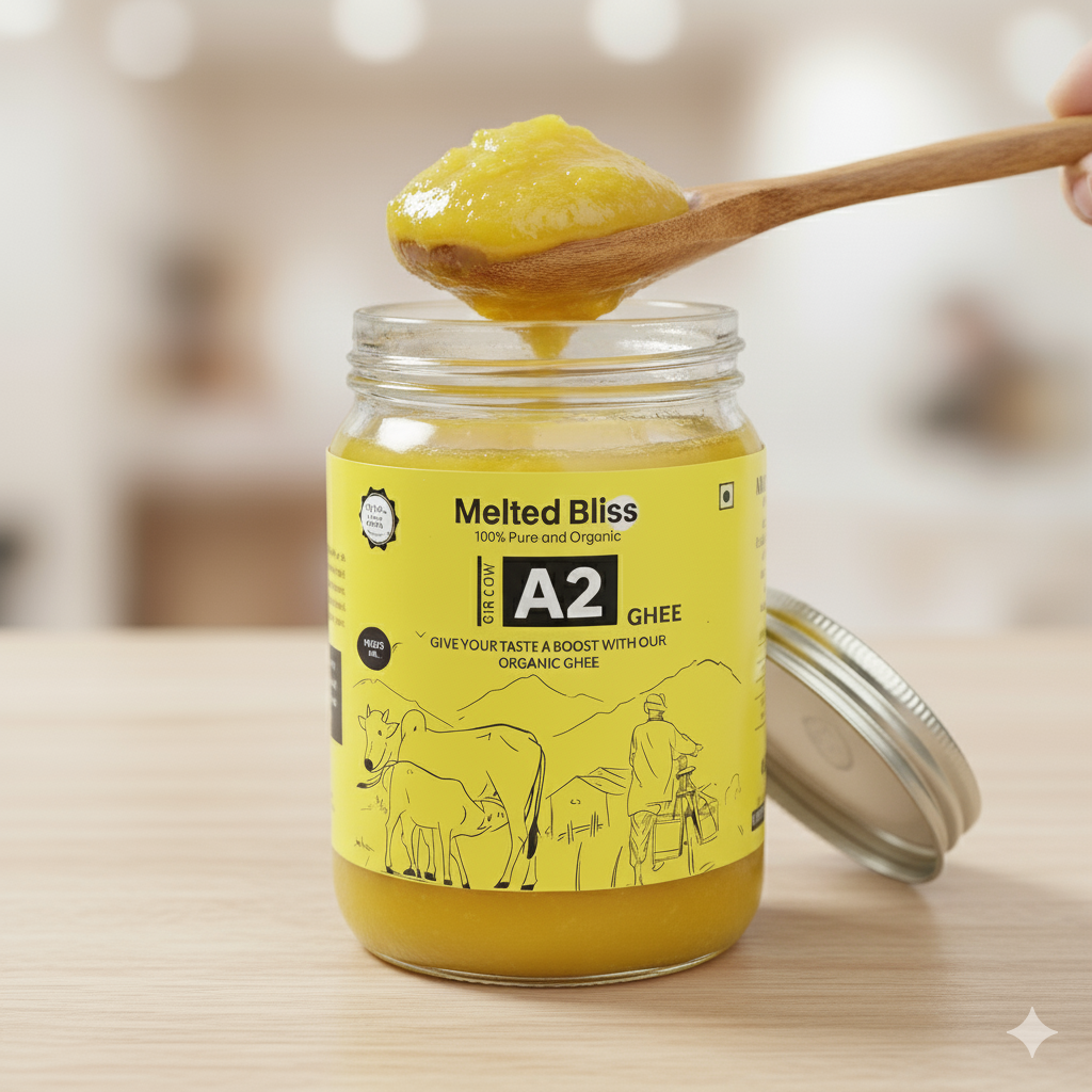 MELTED BLISS® A2 Bilona Cow Ghee | 100% Pure Jaffrabadi Breed Grass Fed | Traditional Desi Ghee in Glass Jar | Lab Tested for Purity | for Cooking, Skin & Hair Care (500) Gram